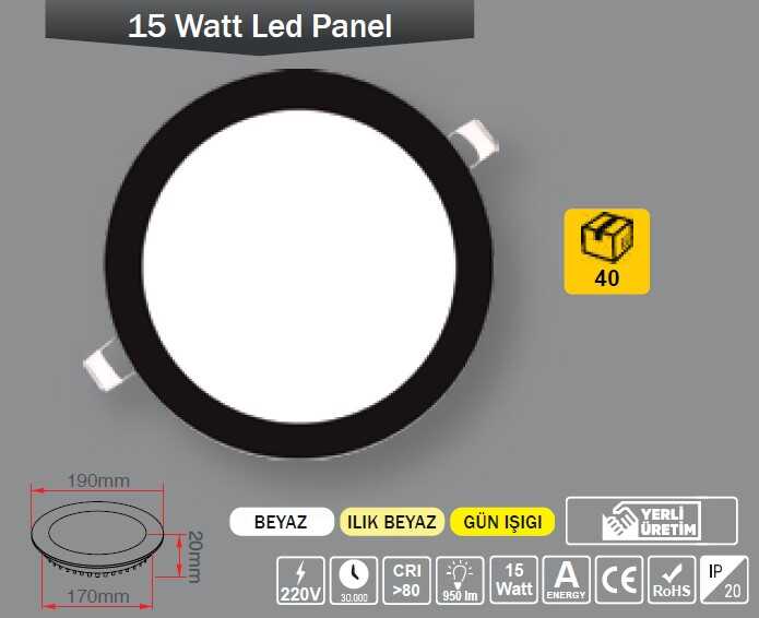 15W / LED PANEL / YUVARLAK / SIVA ALTI / 220V / SİYAH KASA