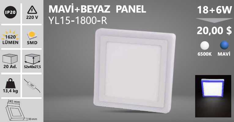 18+6 W / LED PANEL / KARE / SIVA ÜSTÜ / 220V / ÇİFT RENK MAVİ+BEYAZ / YL15-1800-R