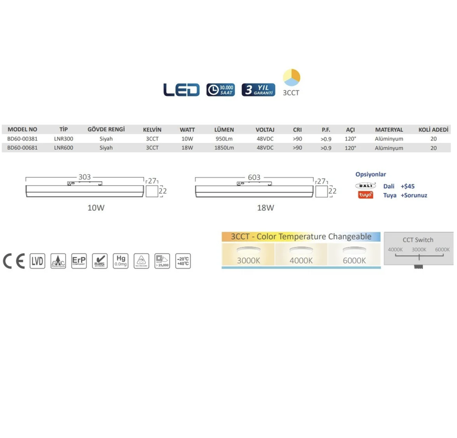 Üç farklı ışık rengi seçeneğiyle dikkat çeker: Beyaz (6500K) net ve güçlü aydınlatma isteyen alanlar için, Ilık Beyaz (4000K) dengeli ve doğal bir ortam için, Gün Işığı (3000K) ise daha sıcak ve davetkâr mekânlar için idealdir. Bu özellik, mağaza, ofis, galeri ve konut projelerinde tek armatürle farklı atmosferler oluşturma imkânı tanır.