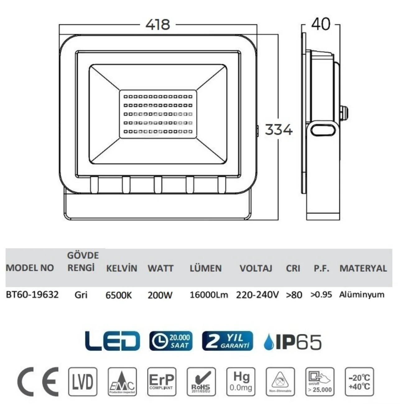 Braytron BT60-19632, 200 Watt gücünde, 6500K beyaz ışık veren yüksek performanslı bir LED projektör modelidir. Güçlü ışık çıkışı ile geniş alanlarda net ve parlak aydınlatma oluşturur; açık otoparklar, bahçeler, depo alanları, spor sahaları ve reklam panoları gibi büyük mekânlarda etkili bir çözüm sunar.